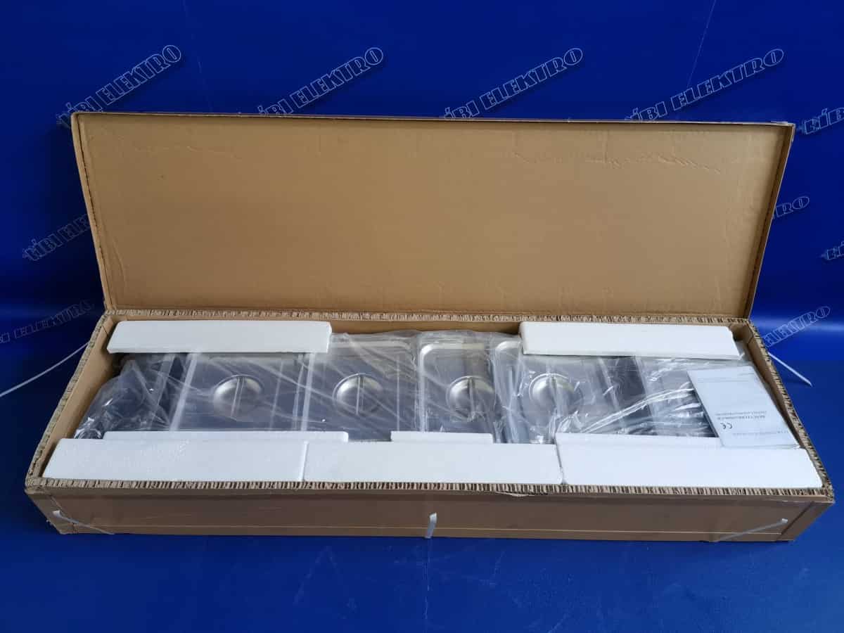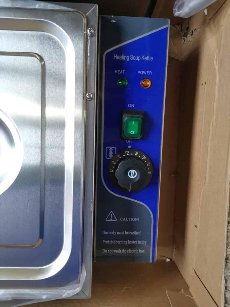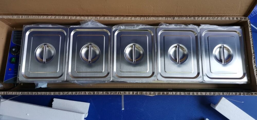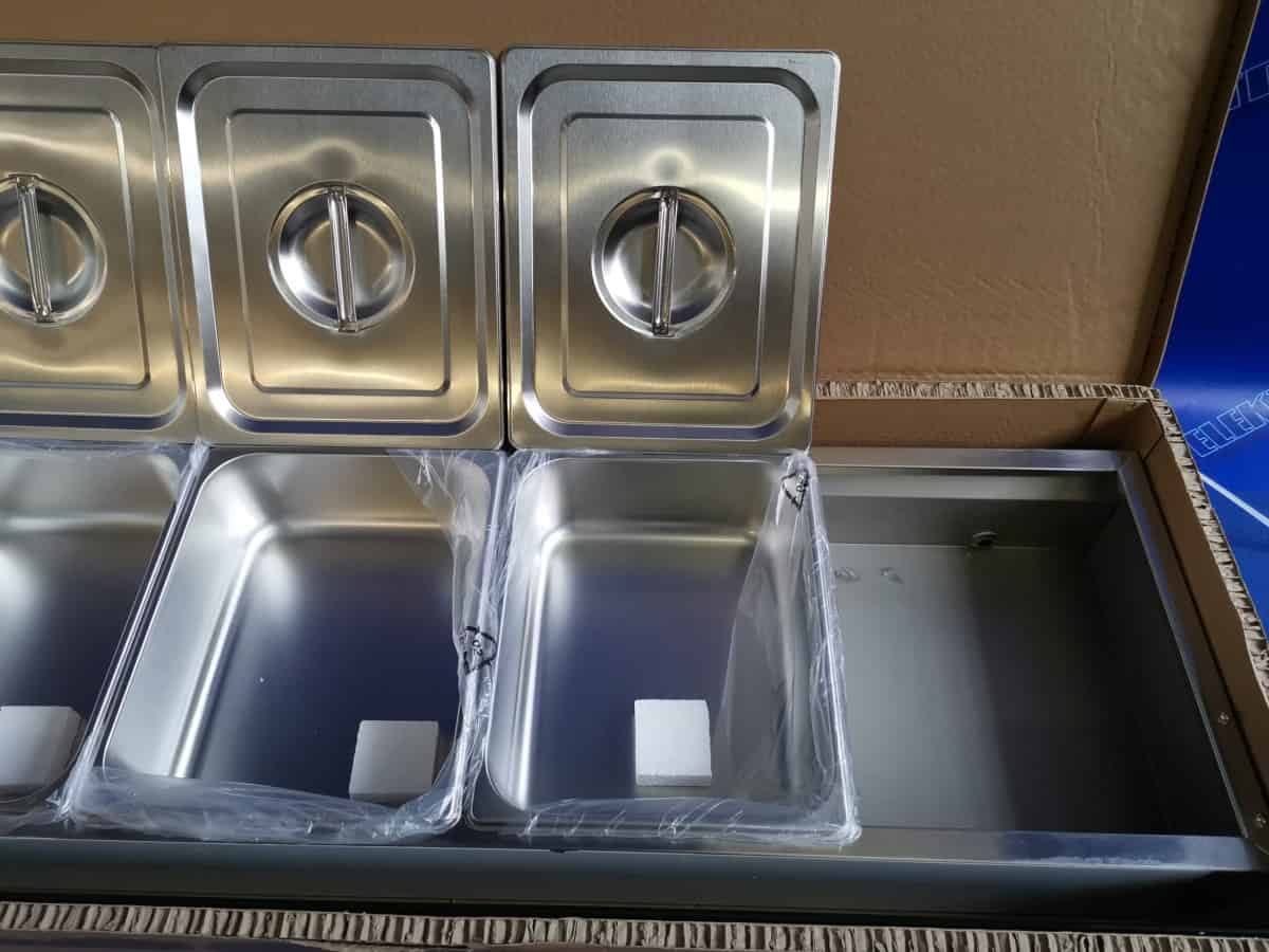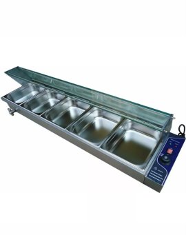 La rejilla para calentar está diseñada para colocarse sobre una encimera. Está equipado con una cubierta protectora de vidrio, ideal para la distribución directa a los invitados. El vidrio se suministra en el mismo paquete, incluidos los soportes y los paneles laterales para su fijación. El vidrio cubre la parte frontal y superior del baño de agua, y hay acero inoxidable , asas completas en los laterales. El baño de agua en sí está hecho completamente de acero inoxidable. 5 x GN 1/2 incluidas tapas con una capacidad de 5,5 litros 1 x elemento calefactor con una potencia de 1,8 kW Termostato 30°C – 110°C Válvula de drenaje Longitud 147 cm Profundidad 35 cm Altura 31,5 cm