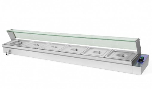 La rejilla para calentar está diseñada para colocarse sobre una encimera. Está equipado con una cubierta protectora de cristal. El vaso se suministra en el mismo paquete, incluidos los soportes y los paneles laterales para su fijación. El vaso cubre la parte frontal y superior del baño de agua, y hay asas de acero inoxidable en los laterales. El baño de agua en sí está hecho completamente de acero inoxidable. 6 x GN 1/2 incluidas tapas con una capacidad de 5,5 litros 1 x elemento calefactor con una potencia de 1,8 kW Termostato 30°C – 110°C Válvula de drenaje Longitud 171,5 cm Profundidad 35 cm Altura 31,5 cm