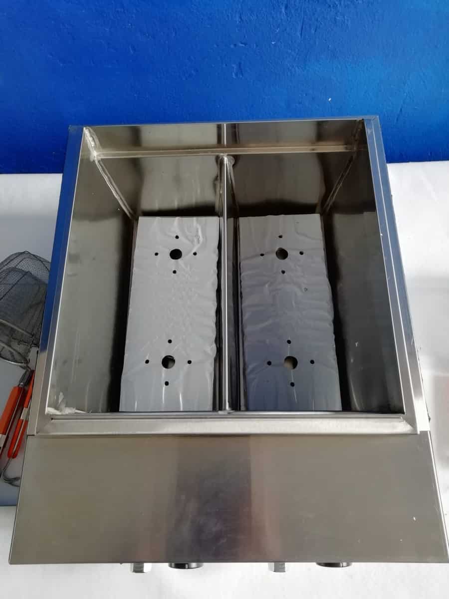 2 compartimentos separados con una capacidad de 6 litros 2 termostatos separados con regulación de 30°C a 110°C 2 x resistencias con una potencia de 1700W Cada compartimento tiene una capacidad de 6 litros 2 x válvula de drenaje 4 x cestas para pasta con una capacidad de 0,5 kg Conexión 220 V Altura 45 cm Anchura 53 cm Profundidad 45 cm Los elementos calefactores están protegidos por una tapa extraíble de acero inoxidable La olla está fabricada íntegramente en acero inoxidable, las asas de la cesta son de madera Apto para cocinar, calentar y descongelar pasta
