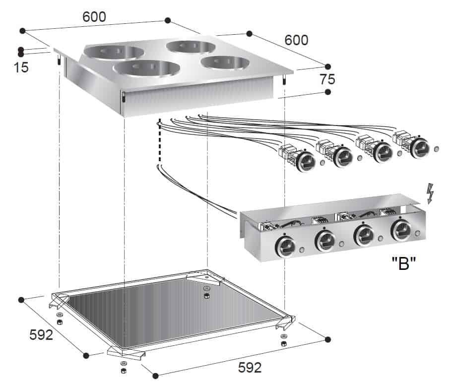 Ancho (mm):600 Profundidad (mm):600 Alto (mm):260 Voltaje (Volt):400 Potencia (kW):2x 2.6 / 2x 1.5 Tipo:Eléctrico Refrigerante:nvt. Número de quemadores: 4 Ancho de instalación (mm): 592 Profundidad de instalación (mm): 592