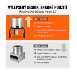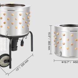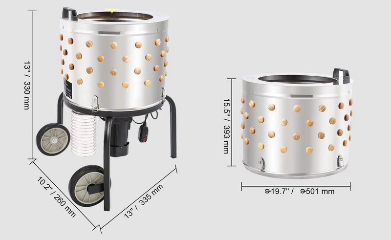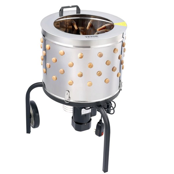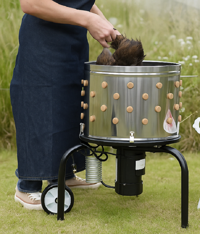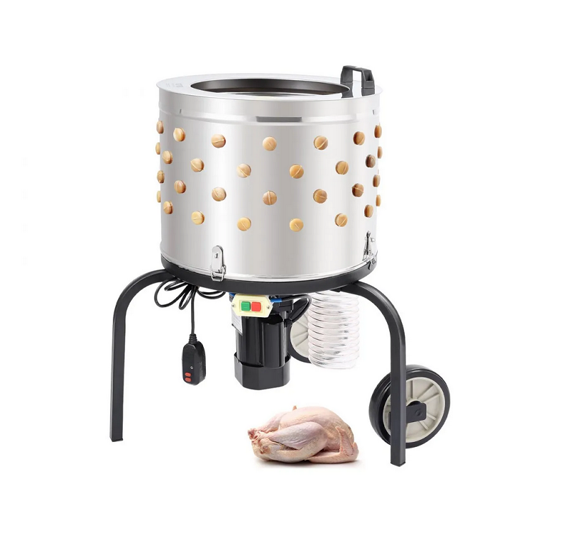 Desplumadora de aves eléctrica con diámetro de tambor 50,8 cm (20") Está diseñado para la eliminación mecánica de plumas de aves de corral sacrificadas. Motor con potencia 550 W y el bobinado de cobre impulsa el tambor a una velocidad 280 rpmLa superficie interior del tambor está equipada con 108 dedos de goma, que al girar limpia las plumas y la suciedad superficial. El tambor es de acero inoxidable. 430Resistente a la corrosión en condiciones normales de uso. El dispositivo está equipado con una conexión de agua para enjuagar durante el funcionamiento. interruptor a prueba de agua, manguera de drenaje y tapa del motor. Su manejo se facilita gracias a un asa y dos ruedas de goma maciza. La capacidad es… 2–4 piezas de aves de corral Por ciclo, el tiempo de ruptura es de aproximadamente 10–30 segundos Dependiendo del tipo y tamaño de las piezas. El paquete incluye 10 dedos de goma de repuestoPotencia del motor: 550 W, bobinado de cobre, 280 rpm Capacidad: de 2 a 4 aves simultáneamente, tiempo de desplumado: 10-30 s Material del tambor: acero inoxidable 430, diámetro 50,8 cm (20") Dedos de desplumado: 108 piezas, goma suave Control: interruptor impermeable Conexión de agua: para un enjuague eficaz durante el funcionamiento Mantenimiento: manguera de drenaje, cubierta del motor, 10 dedos de repuesto en el paquete Contenido del paquete: Desplumadora de aves, manguera de drenaje, 10 dedos de desplumado de repuesto Material del motor: bobinado de cobre puro (mejor disipación del calor y mayor vida útil) Número de dedos de repuesto en el paquete: 10 piezas Seguridad: interruptor impermeable + motor a prueba de salpicaduras Movilidad: 2 ruedas de goma maciza + asa portátil Velocidad de desplumado: 10-30 segundos para 1-4 aves Desagüe de agua: manguera de drenaje (incluida)