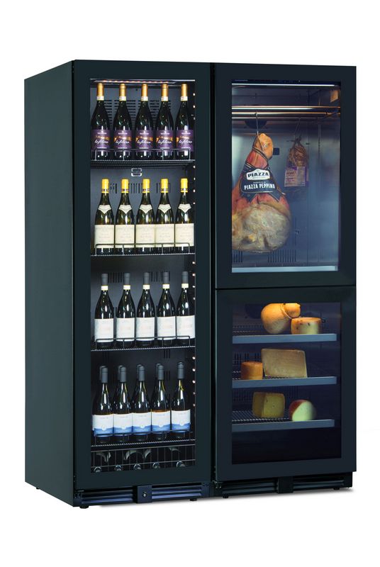 Frigorífico combinado 3 zonas para vinos, embutidos y quesos Superficie exterior fabricada en acero prepintado con tratamiento anticorrosión Superficie interior fabricada en ABS + acero inoxidable 304 Capacidad para vinos Clase 160 botellas. 75 Varillas y ganchos para colgar carne ahumada Iluminación LED Puertas sin marco de cristal continuo Estantes extraíbles de metal Termómetro digital Descongelación automática Clase climática 4 Patas – 8x Voltaje V 220 Consumo de energía: vinos 118 W – carnes ahumadas y quesos 118 W Consumo de energía: Vinos 0,425 KwH/24H – Carnes ahumadas y quesos 0,46 KwH/24H Temperatura del vino 0°C/+10°C Temperatura de la carne ahumada 0°C/+20°C Temperatura del queso 0°C/+20°C Estante (AnxPr): Armario para vinos Estante n.º 5 – mm 478 x 536 no. 1 Cesta – mm 481 x 381 x 136 – carnes ahumadas y quesos Estantes de acero inoxidable no. 3 barras + n.º 6 estantes de 535 x 513 mm