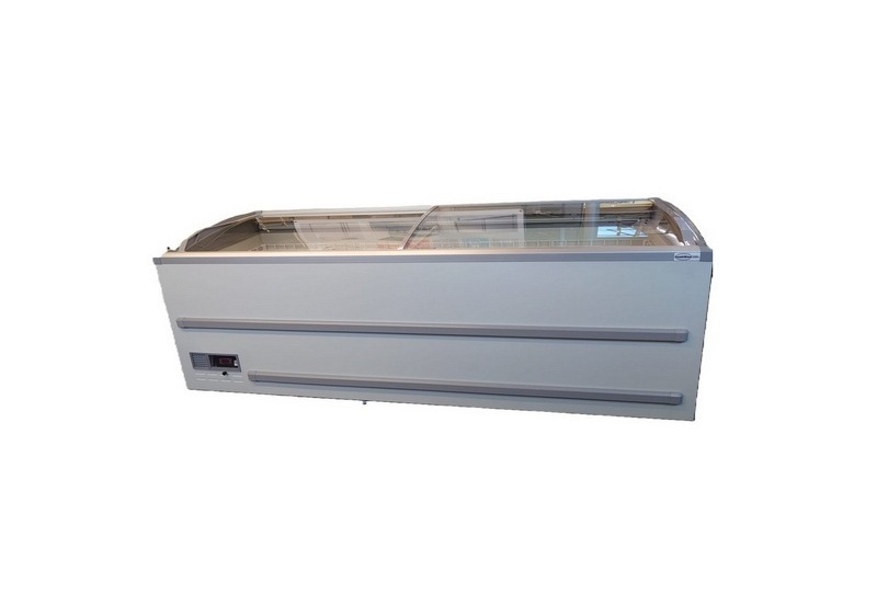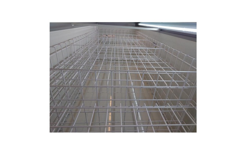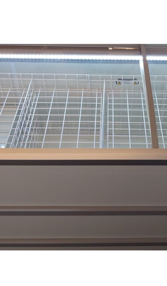 Arcón congelador de cristal no sólo para supermercados con iluminación LED y cestas para una perfecta organización de la mercancía con un volumen de 1216 litros.