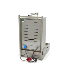 El motor de esta parrilla es muy fiable y está ubicado en la parte inferior. Además, la parrilla para kebab cuenta con una bandeja de goteo de acero inoxidable fácilmente extraíble. Incorpora rejillas reflectantes de acero inoxidable en los laterales. Para completar el pedido, se incluye un cuchillo especial para kebab que corta la carne en finas lonchas.