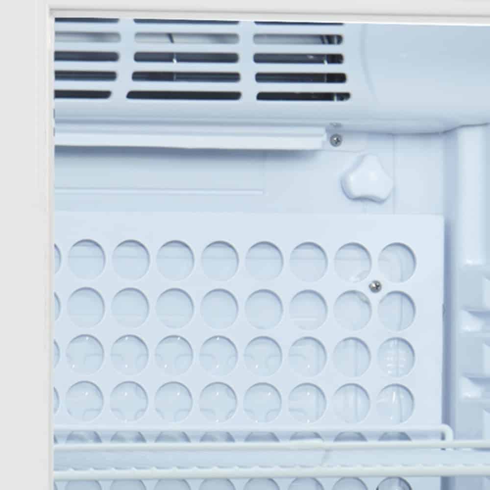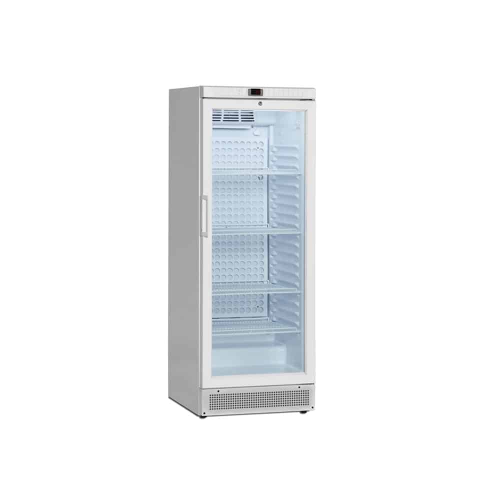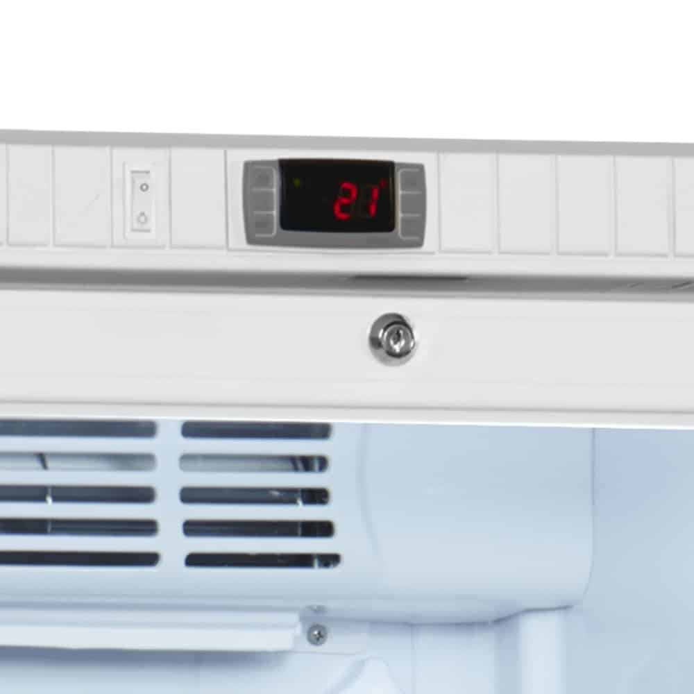 puerta batiente de cristal, termostato electrónico, alarma acústica, conexión de alarma externa, estantes regulables, descongelación automática, pies regulables, refrigeración con ventilador auxiliar