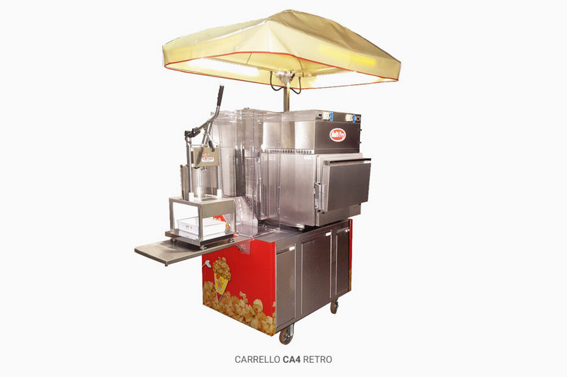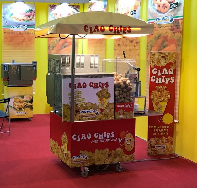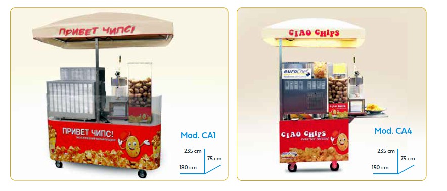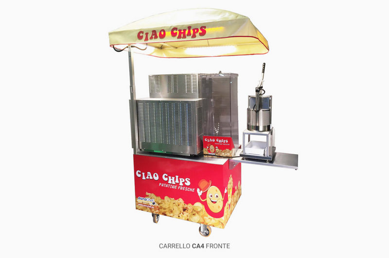 El carrito CIAO CHIPS tiene un aspecto agradable y atractivo y no decepcionará y atraerá a los clientes que se sorprenderán primero por la preparación de las patatas fritas en el lugar, luego por la bondad de este nuevo producto simple y natural. Carro modelo CA1 de 1,8 m de ancho y forma redondeada, disponible opcionalmente con carro más pequeño modelo CA4, más compacto, de 1,2 m de ancho con estante lateral cerrado y 1,7 m de ancho con estante lateral abierto.