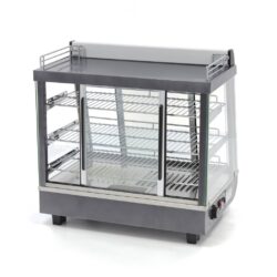 Los clientes disfrutan de comida caliente sin largas esperas. Esta vitrina caliente de 96 litros tiene 67,5 cm de ancho. Es ideal para mantener la temperatura perfecta de pasteles, aperitivos, platos a la parrilla y snacks. El frontal cuenta con una puerta corredera de cristal e iluminación LED interior, para que los clientes puedan ver fácilmente el producto que eligen. Además, dispone de una puerta corredera en la parte trasera para reponer los alimentos con facilidad. Esta vitrina no solo mantiene la comida caliente, sino que también permite una presentación atractiva de los platos preparados.