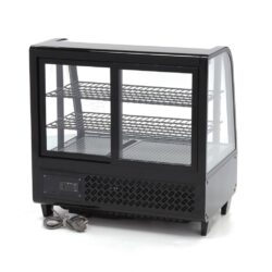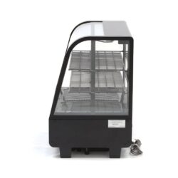 Esta vitrina con ventana frontal curva es un complemento ideal para cualquier panadería, cafetería, cervecería o establecimiento de hostelería. Con una capacidad de 100 litros y dos estantes regulables en altura, permite refrigerar una gran variedad de productos. Gracias a la iluminación LED interior y las cuatro ventanas laterales, los productos se presentan de forma atractiva y son fácilmente visibles. La puerta corredera trasera facilita la entrada y salida de productos.