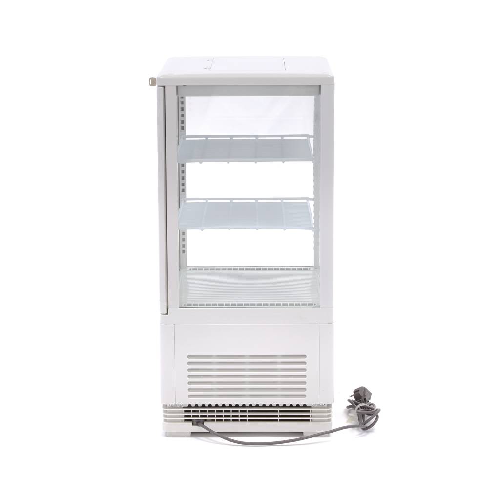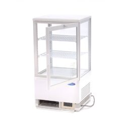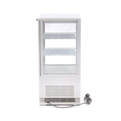 Esta robusta vitrina refrigerada tiene una capacidad de 58 litros. Gracias a sus cuatro ventanas de cristal y a la iluminación LED integrada, los productos se presentan de forma atractiva y profesional en cualquier establecimiento de hostelería. En su interior, cuenta con dos estantes fácilmente ajustables, lo que permite colocar productos de prácticamente cualquier tamaño. Además, al estar equipada con cerradura, puede colocarse sobre una barra o mostrador sin riesgo de que los clientes se sirvan solos.