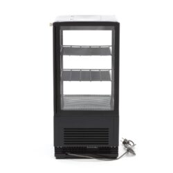 Esta robusta vitrina refrigerada tiene una capacidad de 58 litros. Gracias a sus cuatro ventanas de cristal y a la iluminación LED integrada, los productos se presentan de forma atractiva y profesional, ideal para cualquier negocio de hostelería. Cuenta con dos estantes interiores fácilmente ajustables, lo que permite almacenar productos de prácticamente cualquier tamaño. También se pueden solicitar estantes adicionales. Al estar equipada con cerradura, esta mini vitrina puede colocarse en una barra o mostrador con total seguridad, evitando que los clientes se sirvan solos.