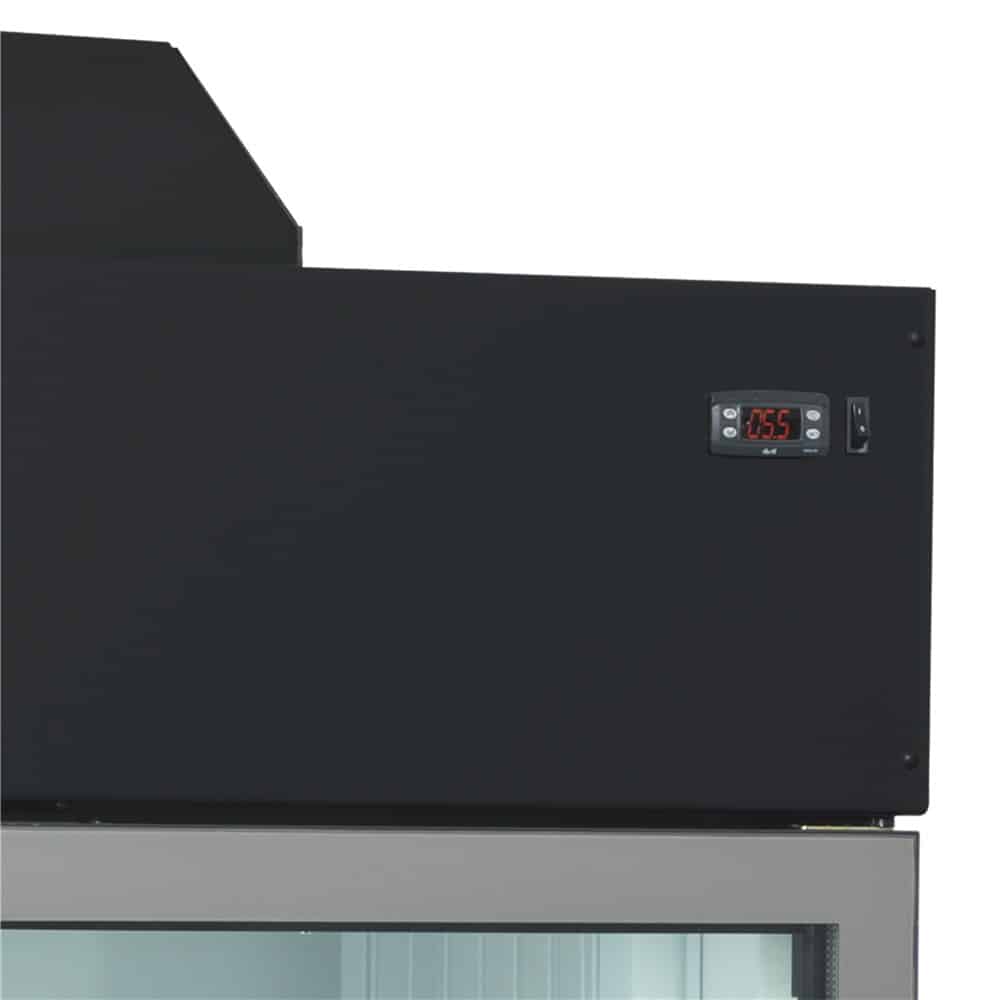 Las vitrinas MTF ofrecen una solución inteligente para aprovechar el valioso espacio disponible en el suelo. Combinan perfectamente con islas de congelación y refrigeración o congeladores de encimera. Las vitrinas MTF se pueden colocar en el centro del espacio (isla) o contra una pared. La ventilación se encuentra en el centro del dispositivo, lo que permite aprovechar toda la profundidad para la instalación incluso contra una pared; no es necesario mantener un espacio de ventilación detrás del dispositivo. La vitrina se entrega con un estante de base fija y dos estantes de rejilla ajustables que se pueden inclinar. Refrigeración ventilada dirigida de lado a centro, ideal para optimizar el espacio de almacenamiento, congelador/refrigerador, fácil conversión entre refrigeración y congelación, ideal con refrigerador/congelador de mostrador, puerta de vidrio con cierre automático y calefacción, exterior negro, descongelamiento automático, patas ajustables